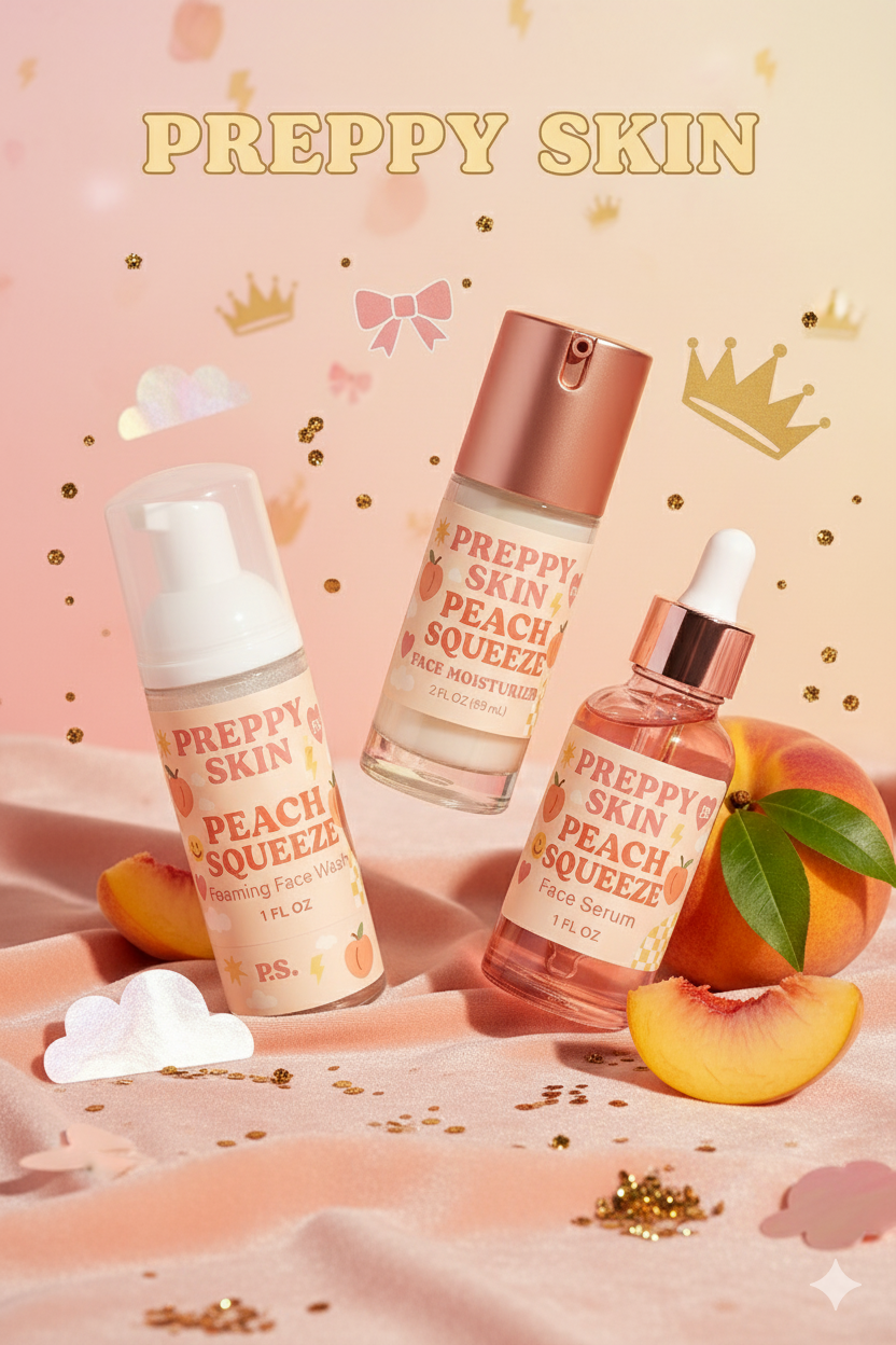 Our all-in-one skincare adventure, has arrived. The Peach Squeeze Collection Is here. Inside you will find your refreshing Face Foam Wash, a nourishing Face Serum, a soothing Face Moisturizer, and a luscious Lip Balm. Plus, enjoy a soft face wash cloth, the gentle Preppy Bar Soap, a Hydrating Face Mask, relaxing Eye Mask, and a fun Heart-Shaped Water Activated Sponge. To keep things exciting, we’ve added a few surprise gifts just for you. Perfect for playful skincare lovers ready to glow and smile every day!