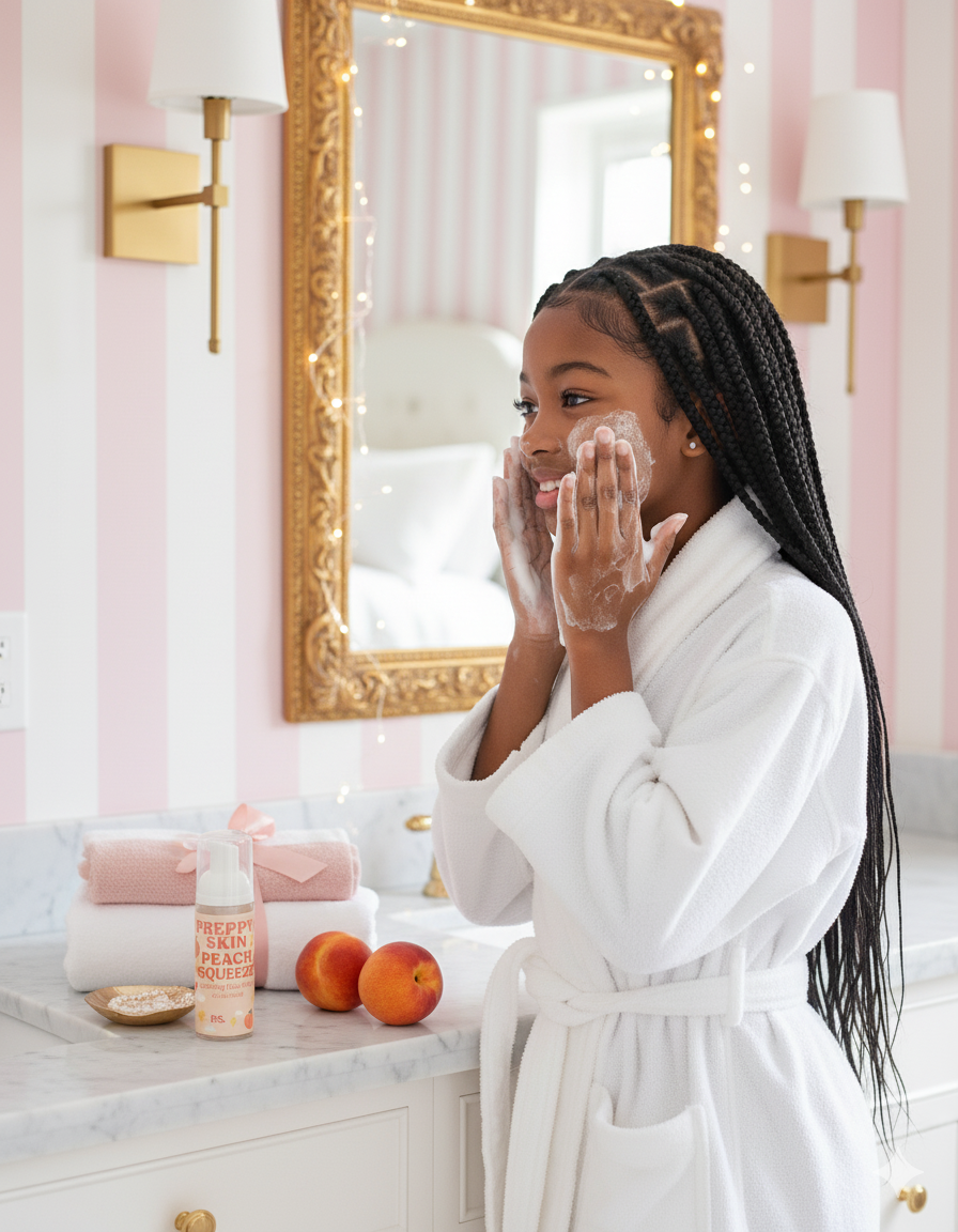Our all-in-one skincare adventure, has arrived. The Peach Squeeze Collection Is here. Inside you will find your refreshing Face Foam Wash, a nourishing Face Serum, a soothing Face Moisturizer, and a luscious Lip Balm. Plus, enjoy a soft face wash cloth, the gentle Preppy Bar Soap, a Hydrating Face Mask, relaxing Eye Mask, and a fun Heart-Shaped Water Activated Sponge. To keep things exciting, we’ve added a few surprise gifts just for you. Perfect for playful skincare lovers ready to glow and smile every day!